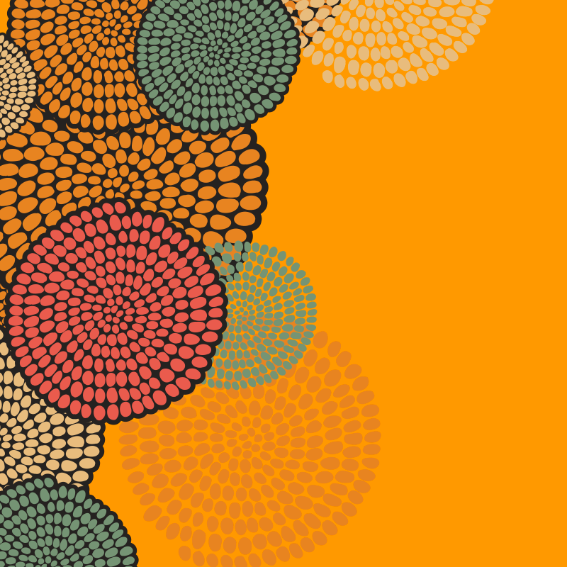 Foto com fundo laranja. No lado esquerdo, há uma composição de formas circulares que lembram flores estilizadas, formadas por pequenas elipses organizadas em espiral. Os círculos aparecem nas cores verde, vermelho, bege e tons de laranja, sobre contornos escuros que destacam o desenho. (fim da descrição)