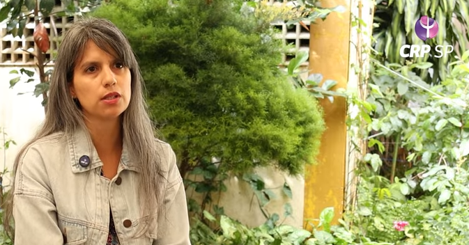 Fotografia da Vice-presidenta do CRP SP, Tayná Alencar Berti de Souza, sentada em um jardim. Ela tem cabelos longos e grisalhos, veste uma jaqueta jeans e possui uma expressão atenta. O plano de fundo é composto por folhagens verdes. O logo do CRP SP está no canto superior direito (fim da descrição).
