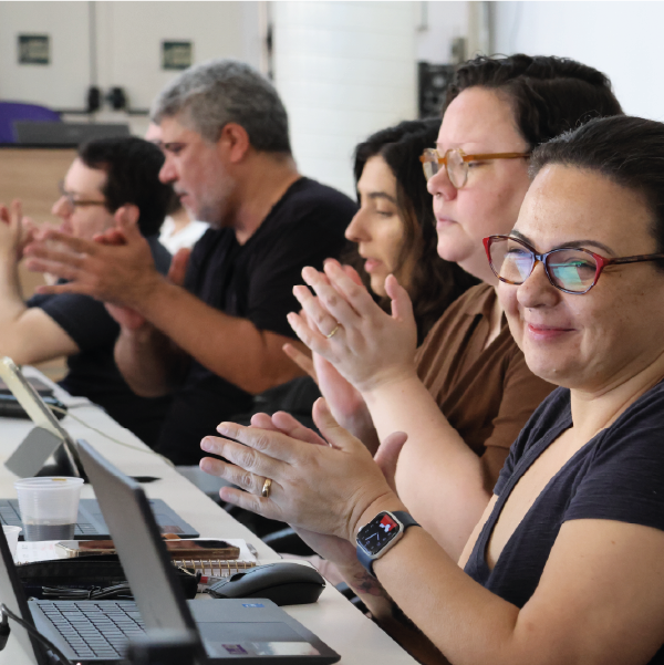 4. Descrição: Close-up lateral de um grupo de pessoas sentadas em uma mesa, aplaudindo. A mulher em primeiro plano, que veste uma blusa escura e óculos, está sorrindo. Há notebooks abertos sobre a mesa. (fim da descrição).
