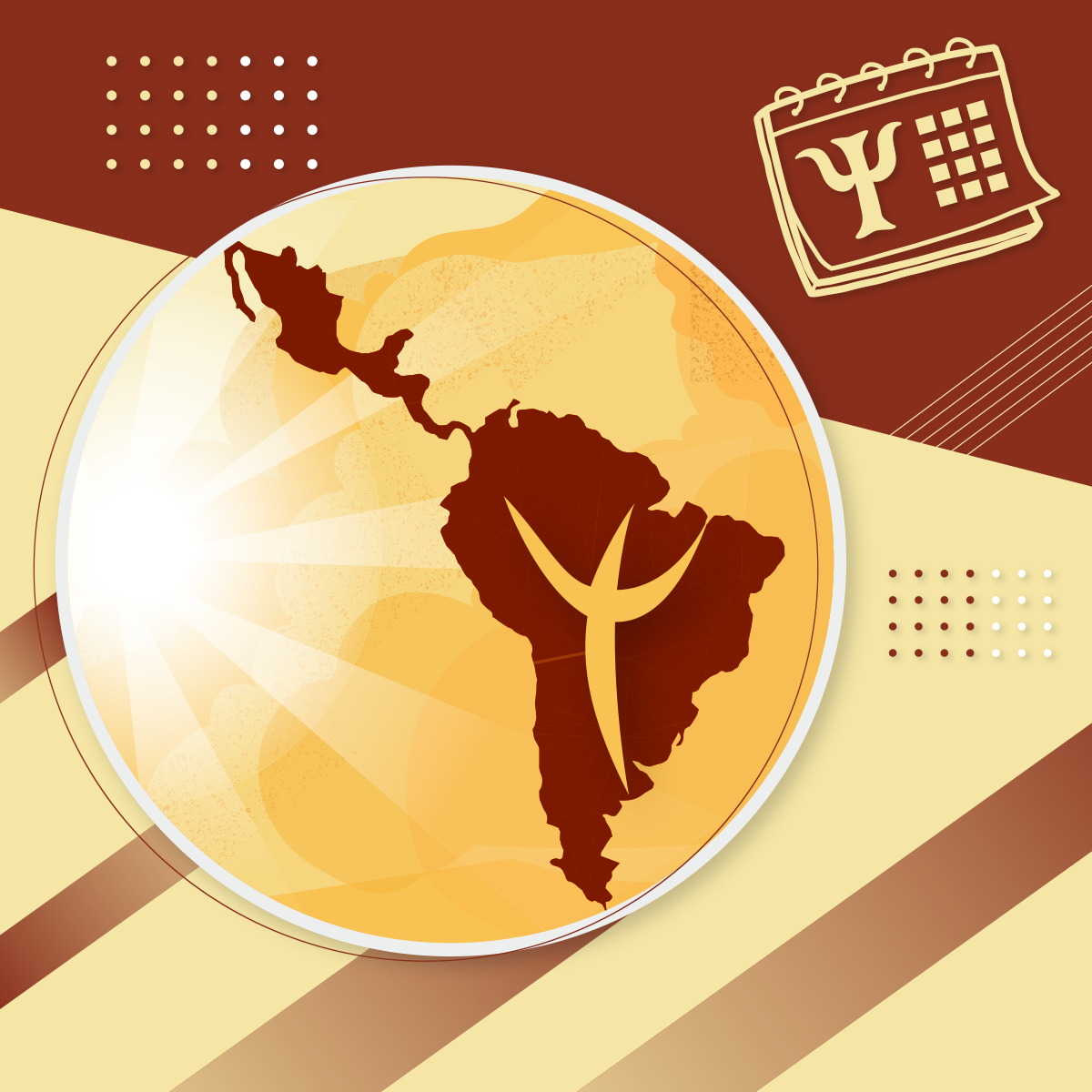 #PraTodosVerem: nesta publicação há um card em tons de marrom alaranjado. Na parte superior, a ilustração de um calendário com o símbolo da Psicologia. No centro, dentro de um círculo, a ilustração do mapa da América Latina com o símbolo da Psicologia dentro.