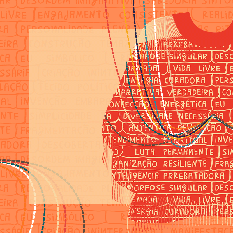 Card quadrado, fundo em tons de laranja e bege com grafismos de palavras em letras maiúsculas e linhas curvas coloridas. À direita, silhueta estilizada em vermelho com palavras brancas e fios coloridos. No lado esquerdo, área bege. (fim da descrição)
