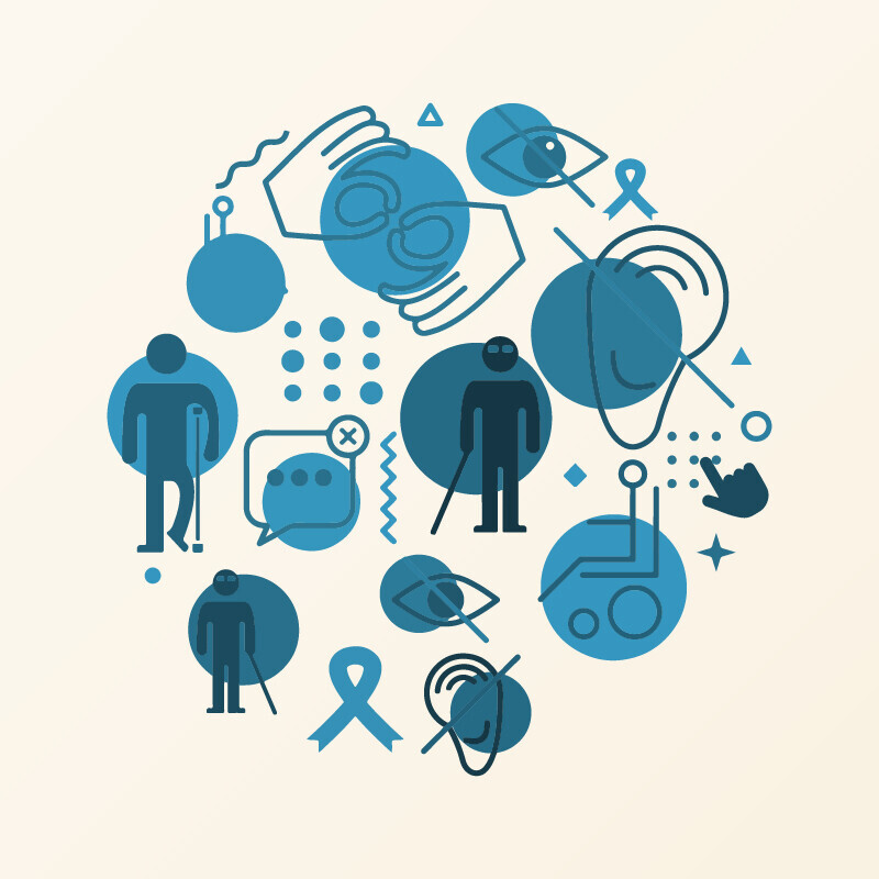 Card quadrado, fundo em tons de bege com grafismos em azul. Ao centro, composição circular formada por ícones estilizados em azul representando diferentes deficiências e elementos de acessibilidade. (fim da descrição)