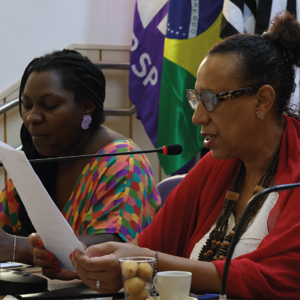 Foto quadrada em close de duas mulheres negras em uma reunião. A mulher à direita é Valéria Campinas Braunstein (CRP 06/31093), conselheira presidenta do CRP SP. Ela está falando em um microfone de mesa, usando um casaco vermelho, óculos de aro estampado e um colar grande de contas. A mulher à esquerda está lendo um documento, vestindo uma blusa colorida e um brinco roxo. Elas estão sentadas em frente à mesa. Ao fundo, veem-se parcialmente as bandeiras do Brasil e do CRP SP. A imagem foca na liderança e engajamento na plenária.
