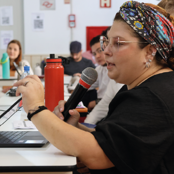 2. Descrição: Close-up de uma mulher de óculos e bandana florida, vestindo preto, falando em um microfone preto e prateado durante uma reunião. Há uma garrafa térmica vermelha e um notebook abertos na mesa. (fim da descrição).