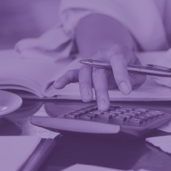 Foto quadrada com filtro roxo. Em close, mãos de uma pessoa utilizam uma calculadora e seguram uma caneta sobre papéis e cadernos abertos. (fim da descrição)