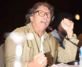 Imagem 3: Foto em close de um homem de óculos e jaqueta bege gesticulando com ênfase enquanto fala ao microfone. (fim da descrição)