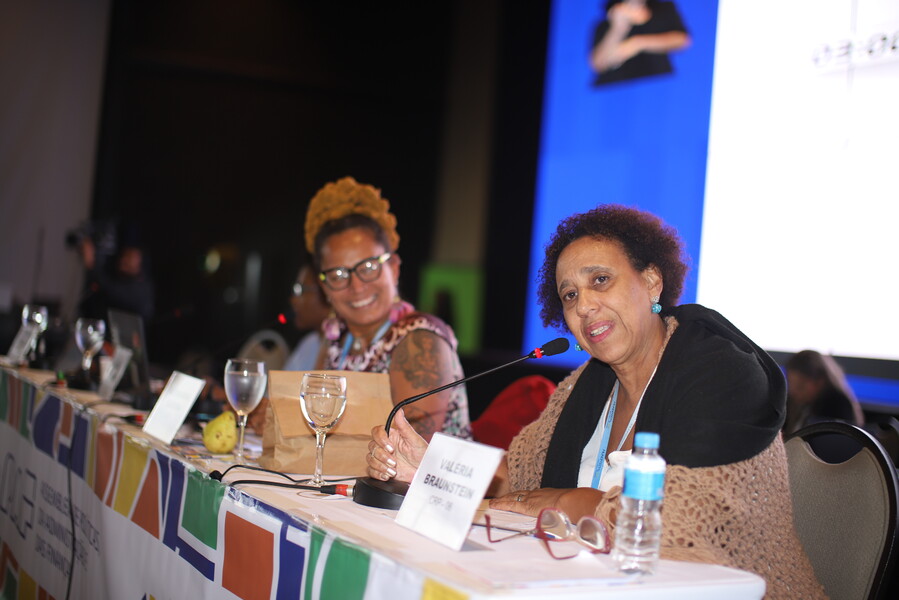 Imagem 5: Foto de uma mulher de cabelos curtos e xale bege falando ao microfone em uma mesa de conferência. Ela possui expressão de diálogo. (fim da descrição)