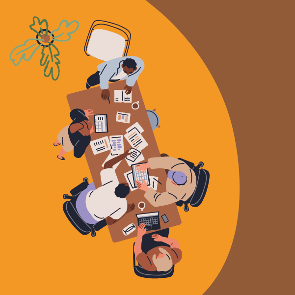 Card quadrado. A composição foca na ilustração aérea da reunião de planejamento: pessoas diversas trabalhando juntas com dispositivos digitais e documentos sobre uma mesa de madeira, emolduradas por um fundo circular amarelo que contrasta com o canto superior marrom. Uma planta decorativa aparece no canto superior esquerdo. (fim da descrição)
