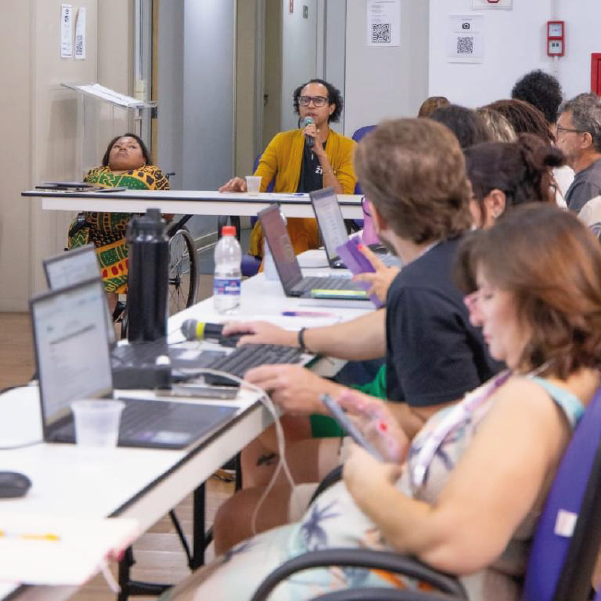 #ParaTodosVerem: Capa Foto quadrada de plenária com mesas em "U" e tela de projeção ao fundo. Participantes utilizam notebooks; em primeiro plano, destacam-se as costas de duas pessoas, uma com blusa amarela e outra com estampa africana. (fim da descrição)