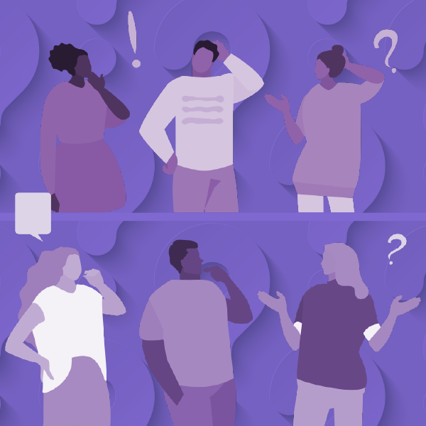 #ParaTodosVerem imagem quadrada com fundo roxo claro e ilustrações de pessoas confusas.