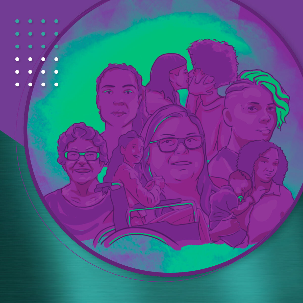 #PraTodosVerem: nesta publicação há um card de fundo em tons de verde e roxo. Dentro de um círculo, a ilustração de mulheres diversas.
