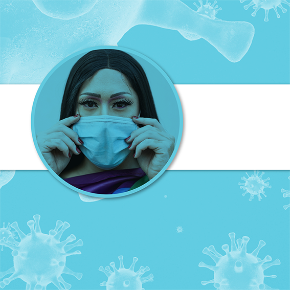 #PraTodosVerem: nesta publicação há um card de fundo azul com ilustrações do coronavírus. Sobrepondo, no centro, a imagem de uma mulher usando máscara.