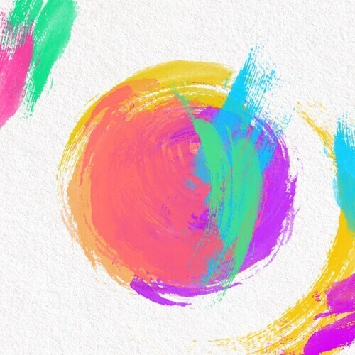Card quadrado, pinceladas coloridas abstratas sobre um fundo de papel texturizado branco. (fim da descrição)