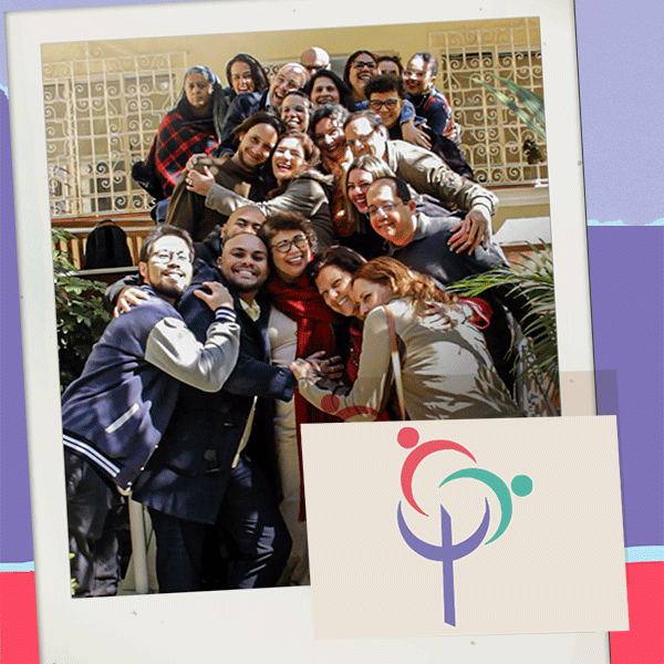 Card quadrado, retratando conselheiras e conselheiros do XVII Plenário do CRP SP sorridentes e em um grande abraço coletivo, ao ar livre, em frente a Subsede Metropolitana. No canto inferior direito, sobreposto à imagem, aparece o logotipo do Conselho Regional de Psicologia de São Paulo (CRP SP), e a identidade visual da campanha a Psicologia que transforma, um ícone com traços que formam o símbolo da Psicologia nas cores roxa, vermelha e verde, representando um abraço, conexão, crescimento e diversidade. O fundo da imagem é composto por blocos em tons pastel de roxo, azul e vermelho.