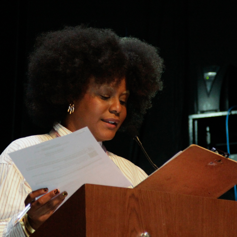 Quinta foto: Close de uma mulher negra com um grande cabelo afro, camisa listrada clara, falando em um púlpito de madeira.