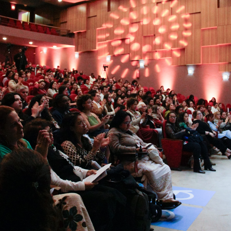 Quarta foto: Uma foto do auditório, com muitas pessoas sentadas em poltronas vermelhas, aplaudindo. A plateia é diversa em raça e gênero, e a cena transmite engajamento e reconhecimento.
