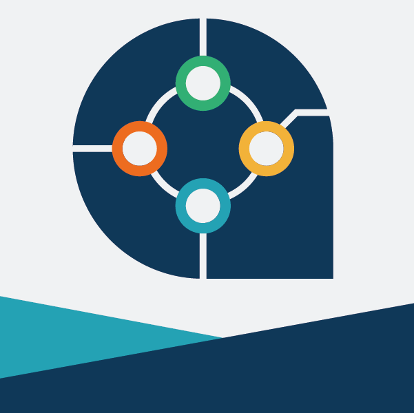 Imagem com fundo claro e detalhes coloridos. No centro, há uma figura que lembra um balão de diálogo, dividida por linhas brancas. Dentro dessa forma, estão quatro círculos conectados em formato de roda: um verde no topo, um laranja à esquerda, um amarelo à direita e um azul embaixo. A base da imagem tem uma faixa laranja inclinada à esquerda e uma faixa azul escura à direita. (fim da descrição)