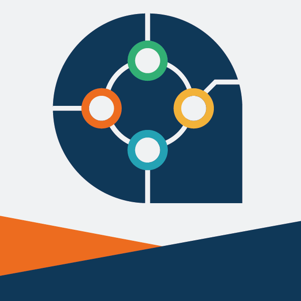 Card quadrado com fundo branco. No centro, uma forma azul escura parecida com a letra "P" ou uma gota de localização, dividida em quatro partes. Dentro dela, quatro círculos coloridos (verde, laranja, amarelo e azul) estão conectados por uma linha curva, formando um ciclo. Na base da imagem, faixas diagonais em laranja e azul escuro completam a composição. (fim da descrição)