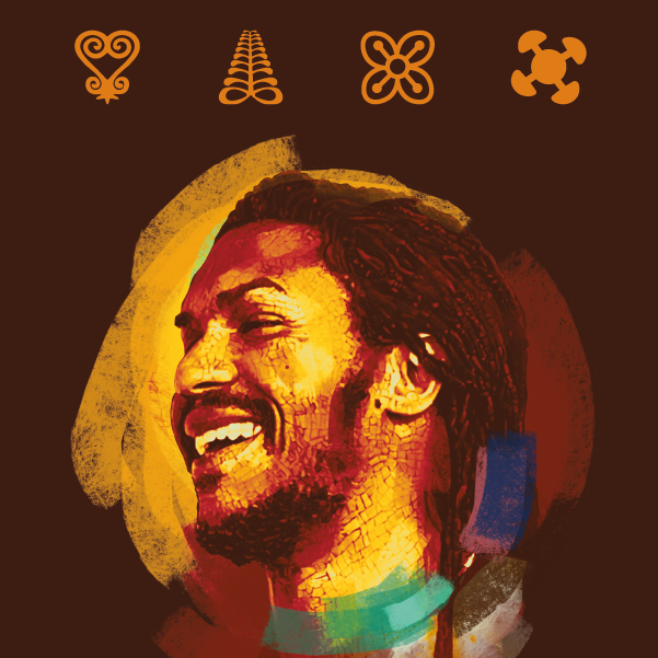Card quadrado com fundo marrom escuro. No centro, há a ilustração colorida de um homem negro sorridente com dreadlocks presos. O rosto é iluminado por tons vibrantes de amarelo, laranja e vermelho, com detalhes em azul. Acima da cabeça, há quatro símbolos Adinkra em amarelo, representando valores como amor, sabedoria, união e comunidade. A imagem transmite alegria, ancestralidade e orgulho cultural.(Fim da descrição).