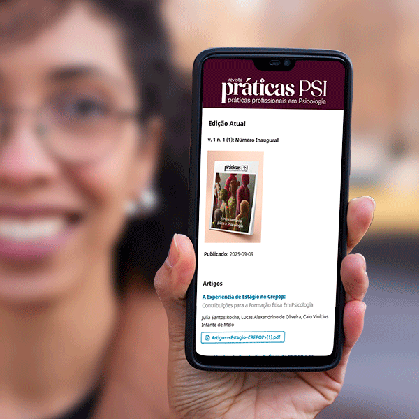 Card quadrado, com a foto de uma pessoa segurando um celular. Na tela do celular, a imagem de uma revista digital e o texto da chamada da revista "práticas PSI, práticas profissionais em Psicologia". A tela do celular apresenta dados da edição atual, como nome do volume, e dados de um artigo, como título e autores. (fim da descrição)