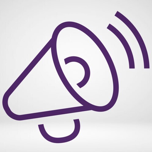 Card quadrado, fundo branco com a ilustração de megafone roxo ao centro. (fim da descrição)
