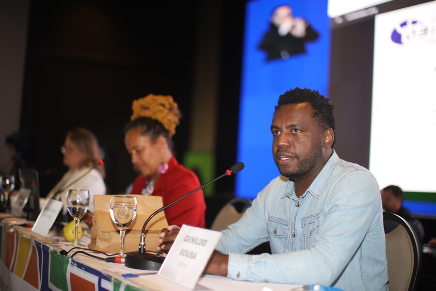 Imagem 2: Foto de um homem negro de camisa jeans falando ao microfone durante o evento. Ele demonstra atenção e foco. (fim da descrição)