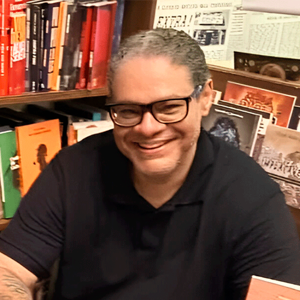 #ParaTodosVerem: Fotografia de um plano médio de um homem de pele clara e cabelos grisalhos curtos, sorrindo expressivamente. Ele usa óculos de armação escura e uma camisa polo preta. Ao fundo, uma estante repleta de livros coloridos e quadros com ilustrações em estilo de quadrinhos ou artes gráficas, criando um ambiente cultural e intelectual. A iluminação é quente e acolhedora. (Fim da descrição)