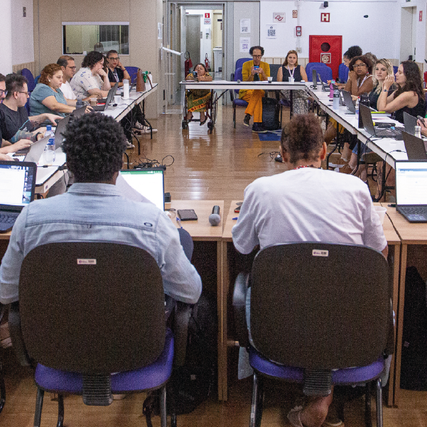 #ParaTodosVerem: Capa Foto quadrada de plenária com mesas em "U" e tela de projeção ao fundo. Participantes utilizam notebooks; em primeiro plano, destacam-se as costas de duas pessoas, uma com blusa amarela e outra com estampa africana. (fim da descrição)