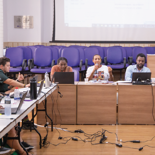 #ParaTodosVerem: Imagem 3 Foto quadrada da mesa diretiva com quatro integrantes negros. Ao centro, uma mulher fala ao microfone e, ao seu lado, um homem opera um notebook. Fios e equipamentos eletrônicos aparecem sobre o piso de madeira. (fim da descrição)
