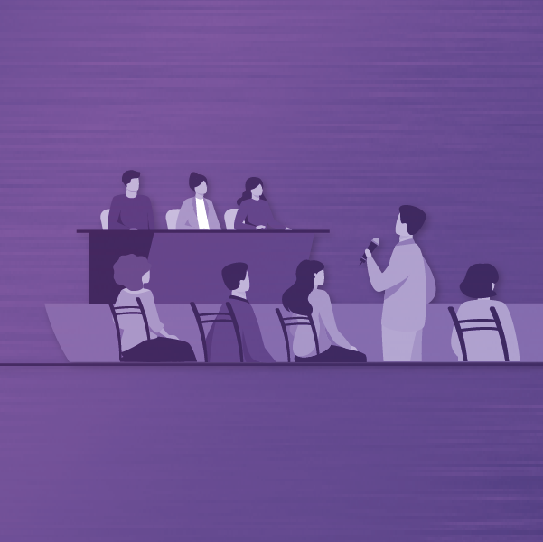 (#ParaTodosVerem) Ilustração em tons de roxo mostrando uma assembleia: pessoas sentadas em cadeiras assistem enquanto uma pessoa em pé fala ao microfone para uma mesa com três integrantes. Estilo gráfico simples e minimalista, sem expressões faciais detalhadas, simbolizando debate e participação coletiva. (Fim da descrição).