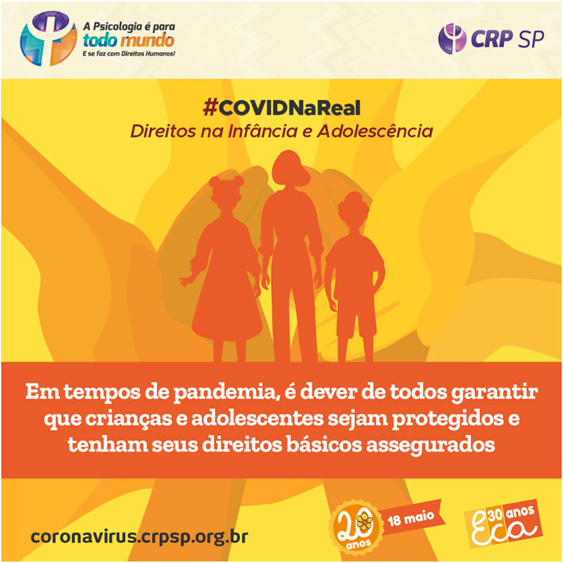 Card com fundo amarelo resume o texto da legenda escrito em cor laranja, marrom e amarelo. O fundo do card traz o desenho da silhueta de duas crianças e de um adolescente, juntos, rodeados por linhas que remetem a mãos que os acolhem. No cabeçalho superior direito está o logotipo do CRP SP e à esquerda, o do mote da gestão: “A Psicologia é para todo mundo. E se faz com Direito Humanos!”, inseridos sobre fundo amarelo claro. No rodapé está o site especial do CRP SP na pandemia e os selos dos 20 Anos do 18 de Maio e do ECA 30 Anos.